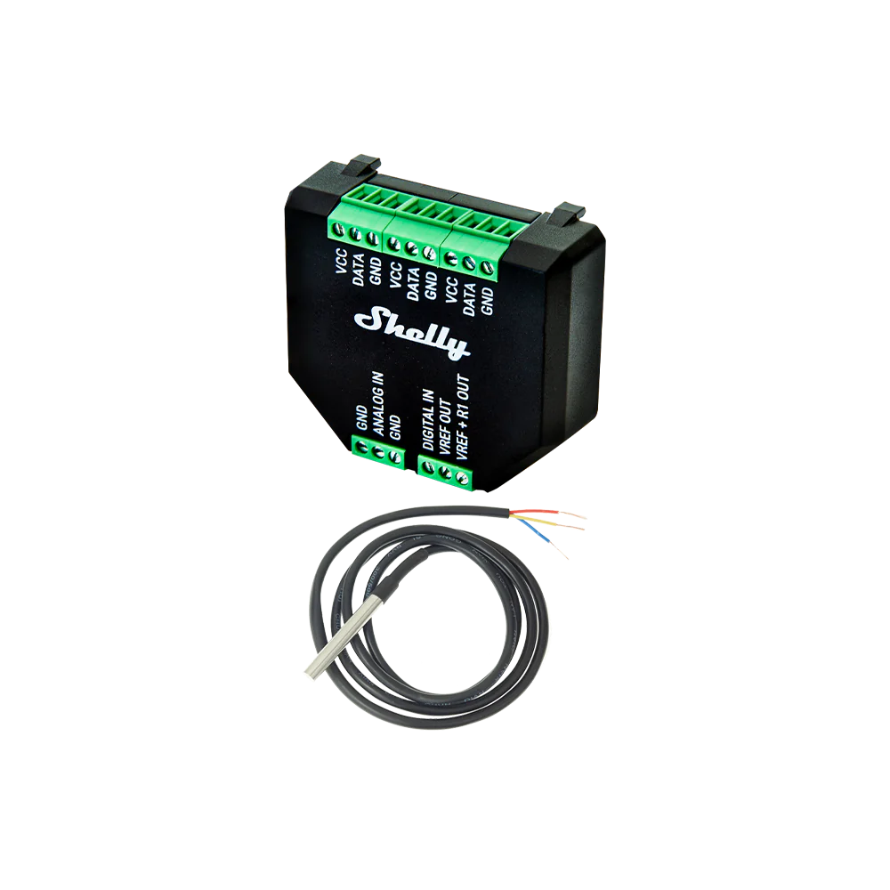 O coração deste sistema é o Shelly Plus Add-On , uma interface de sensor isolada e altamente confiável. Ele se conecta diretamente à sonda de temperatura e se integra perfeitamente aos seus relés Shelly Plus, Gen3 e Gen4 . Isso significa que você pode medir a temperatura com precisão e, com base nesses valores, ativar automaticamente dispositivos como sistemas de aquecimento, ar-condicionado ou ventilação, ou receber notificações instantâneas no seu celular.
